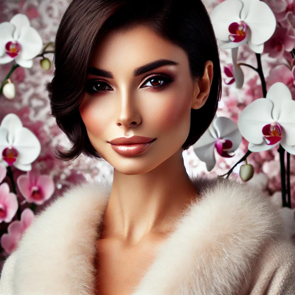 Una mujer de elegancia serena posa frente a un fondo de orquídeas en flor. Su mirada, intensa y dulce a la vez, irradia confianza y sutileza. El suave abrigo de piel clara realza su porte sofisticado, mientras la luz acaricia su rostro, revelando una belleza clásica y atemporal —una fusión de fuerza, calma y perfección natural.